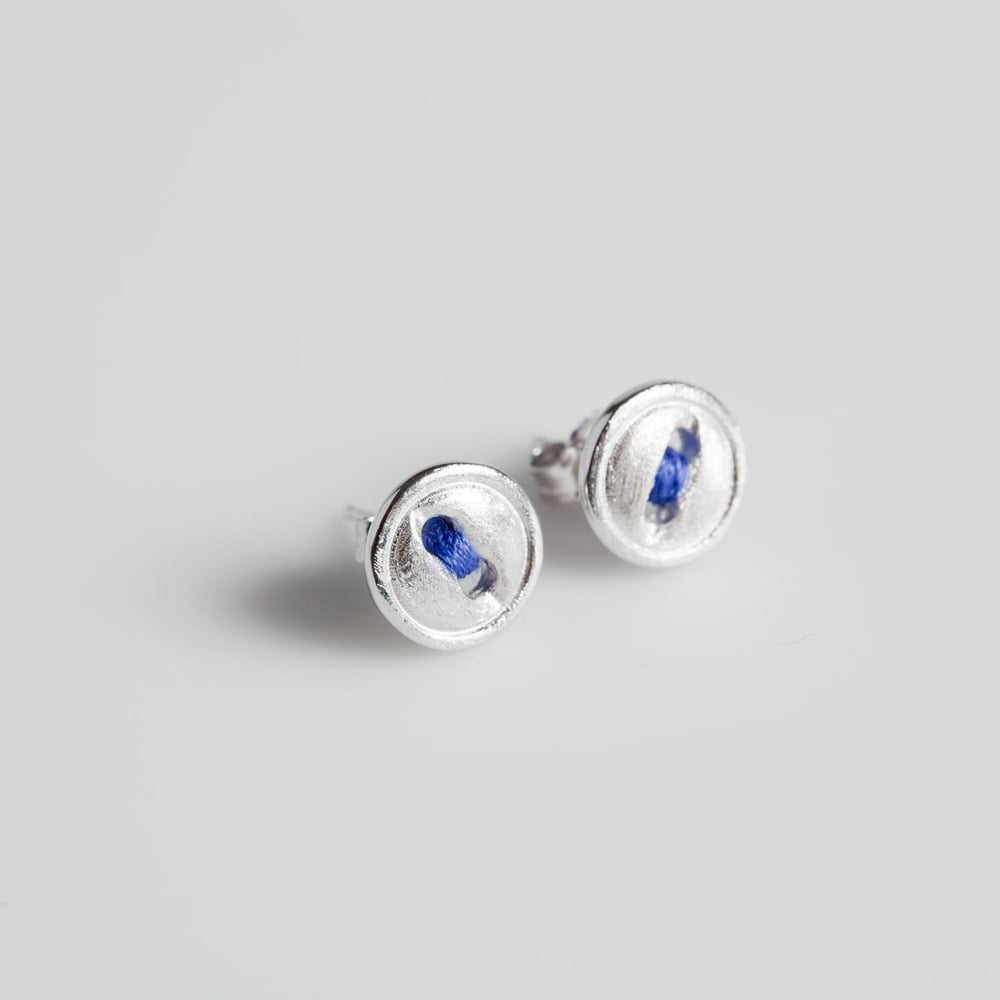 Handgemaakte zilveren oorknoopjes met blauw draadje, oorbellen Antwerpen, goudsmid, juweelontwerp